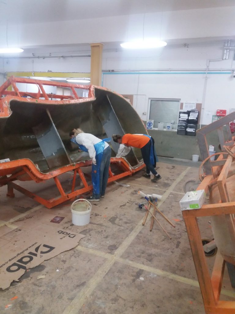 — укладывают материал (стекловолокно) в форму, кисточкой обмакивают весь материал специальным раствором , потом расправляют валиком , и так повторяется  процесс