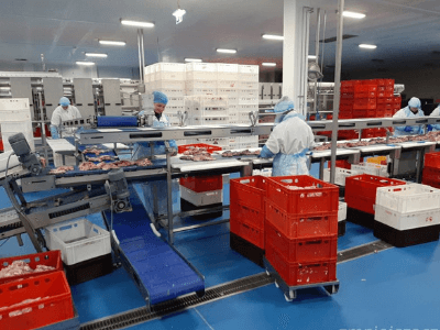 Разделкой занимается машина, задача только контролировать работу машины и качество продукта, а также складывать продукцию в пластиковые лотки